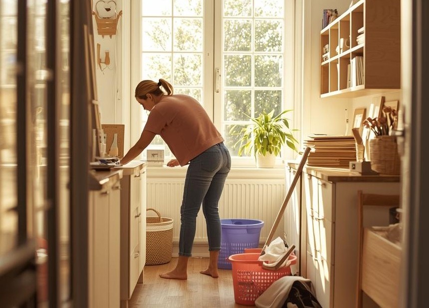 Danielle nadat een keukenkastje met pannen opnieuw is ingericht